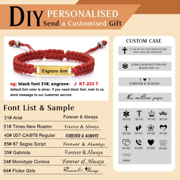 La plaque métallique du bracelet est gravée avec précision, garantissant un rendu net et lisible qui résiste au temps. Contrairement aux impressions qui s’effacent, la gravure personnalisée reste intacte au quotidien, même après de nombreux usages.
