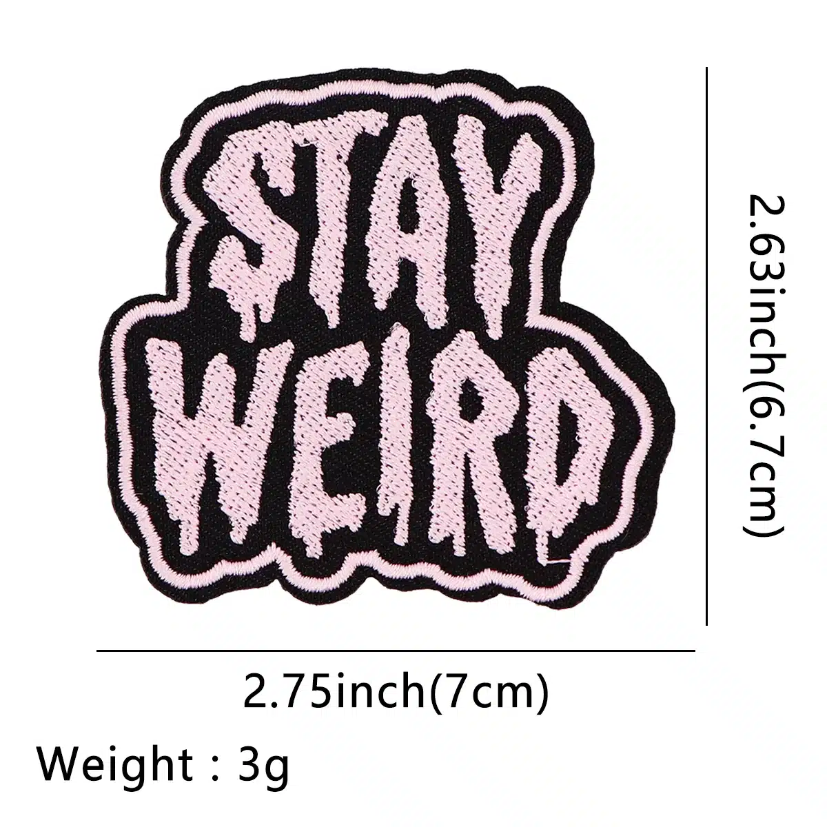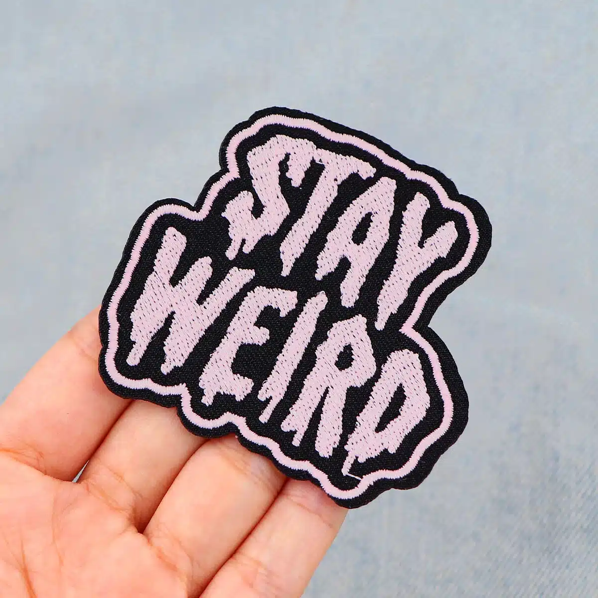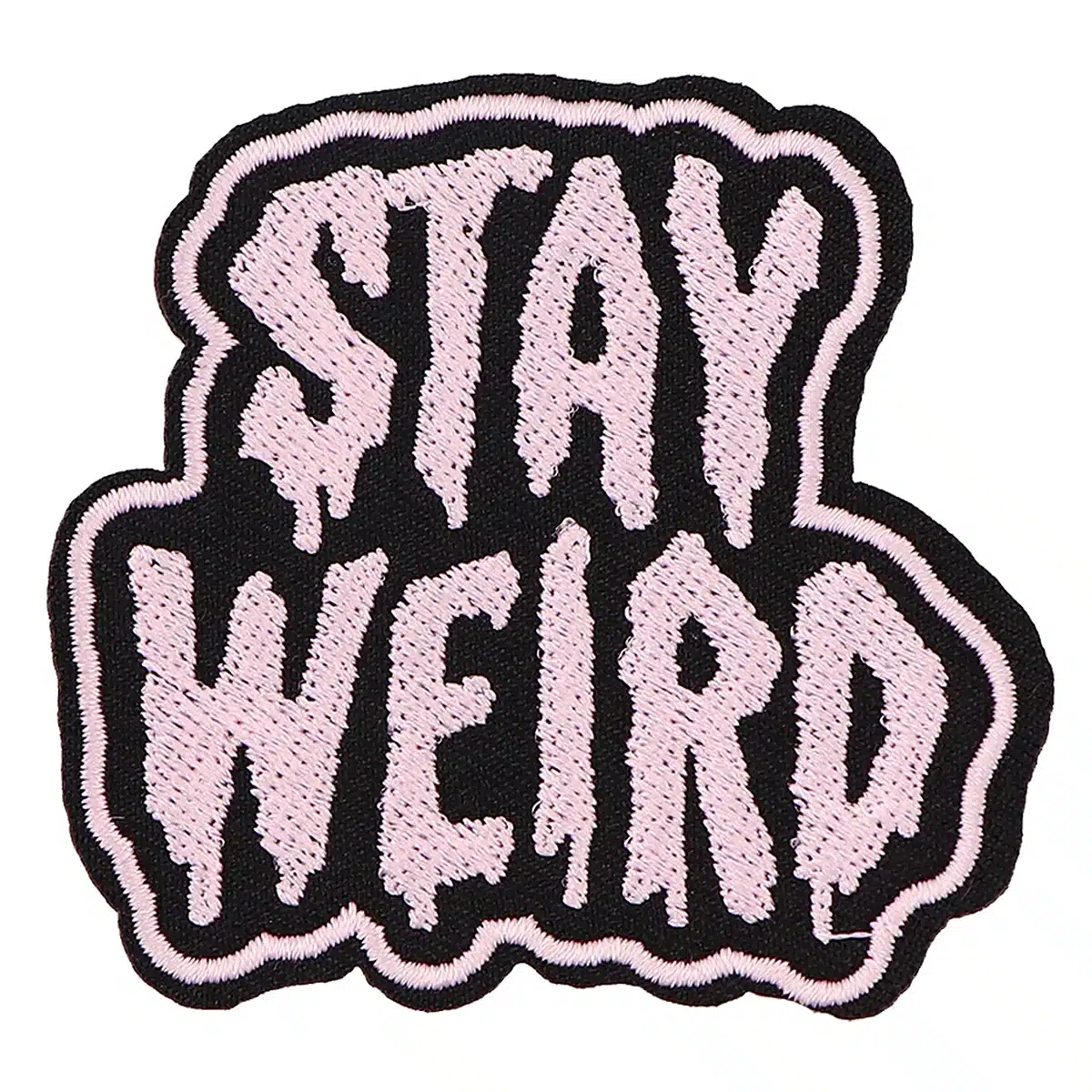 Patch brodé original Stay Weird, thermocollant ou à coudre, pour personnaliser vêtements et accessoires avec style et couleur.