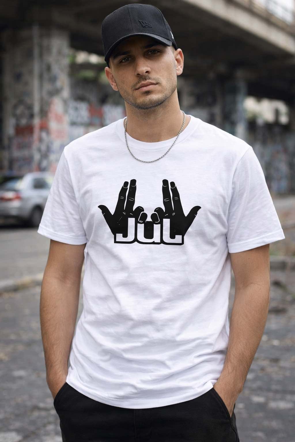 Le motif est centré sur le torse : le célèbre signe de Jul réalisé avec les mains, souvent utilisé par l’artiste dans ses clips et concerts. Ce symbole est devenu un véritable marqueur de ralliement pour ses fans. Il est accompagné du nom « Jul » dans une typographie urbaine forte et simple, pour un rendu visuel percutant mais sobre, idéal à porter au quotidien.