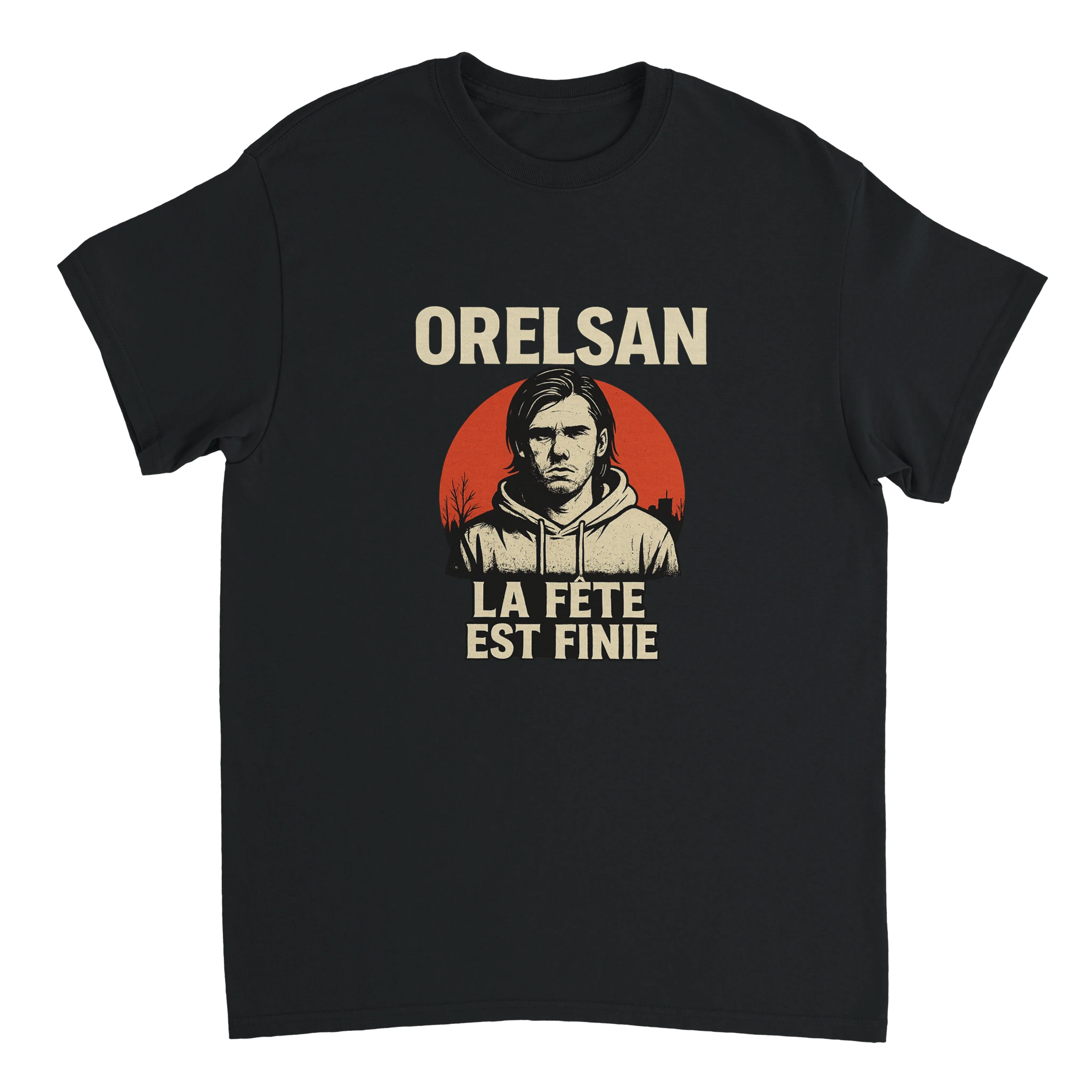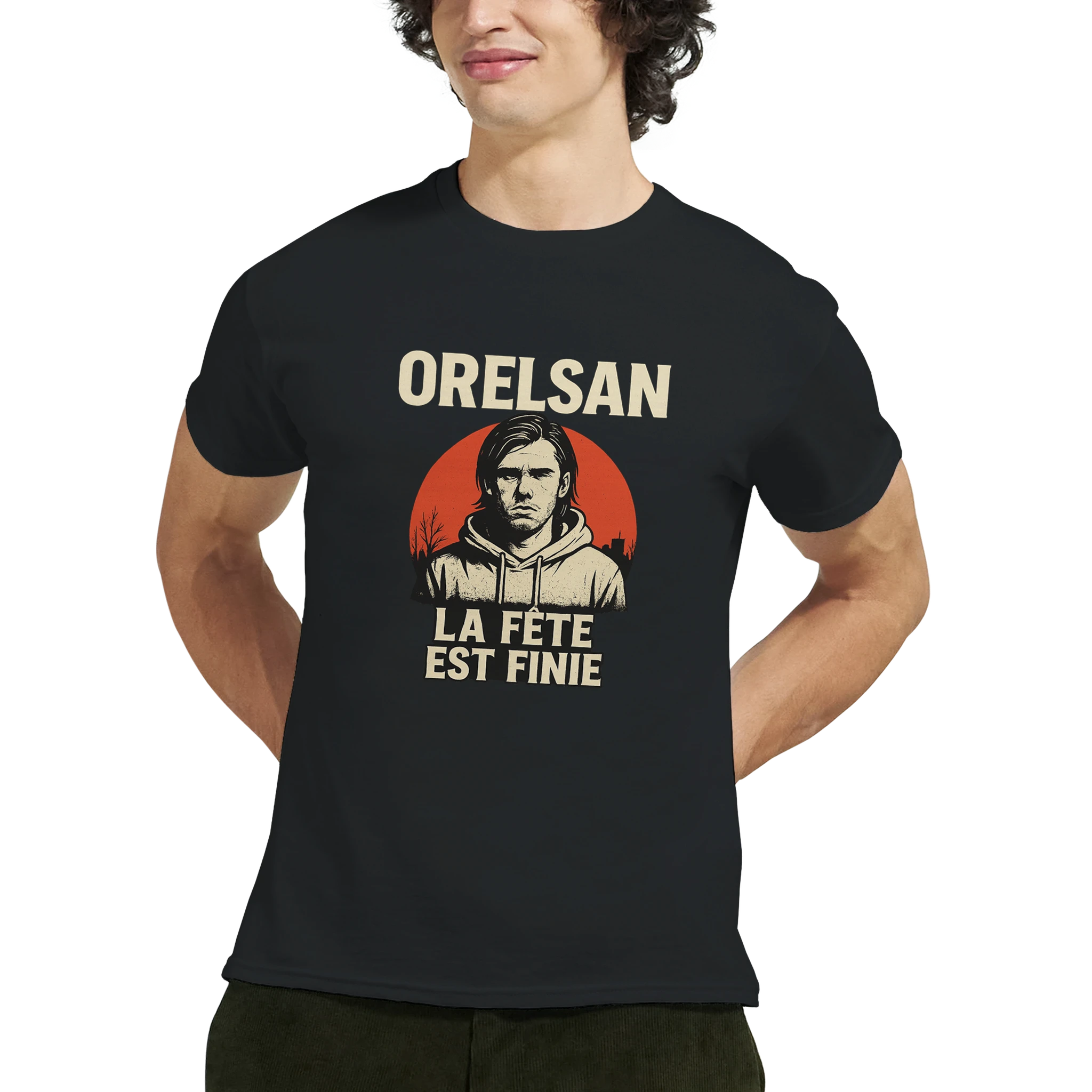 T-shirt Orelsan La Fête est Finie en coton unisexe. Design minimaliste inspiré de l’album culte, parfait pour un look urbain et musical.